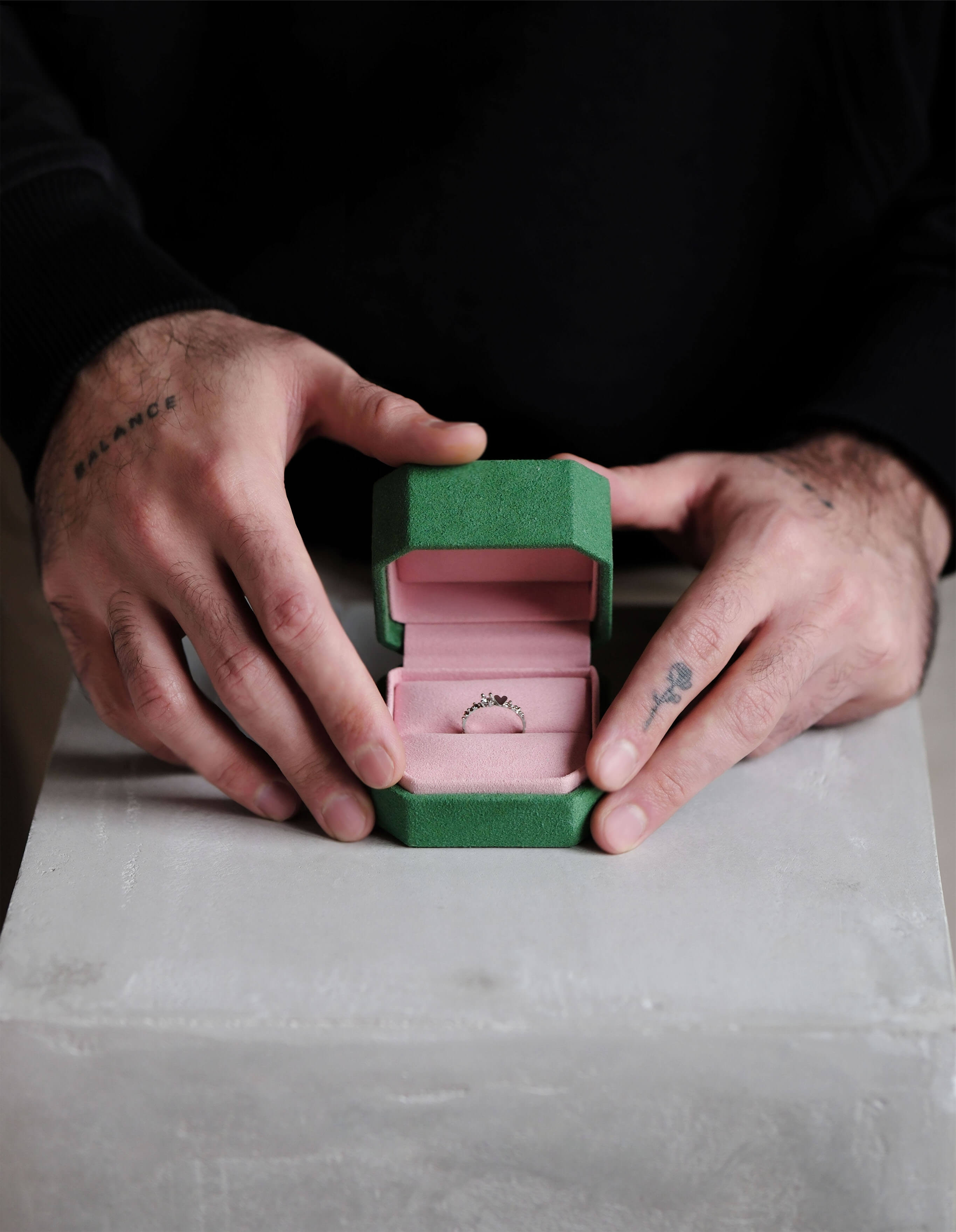 We work with recycled gold, carefully chosen gemstones, and a deep respect for the process — because true beauty takes time.