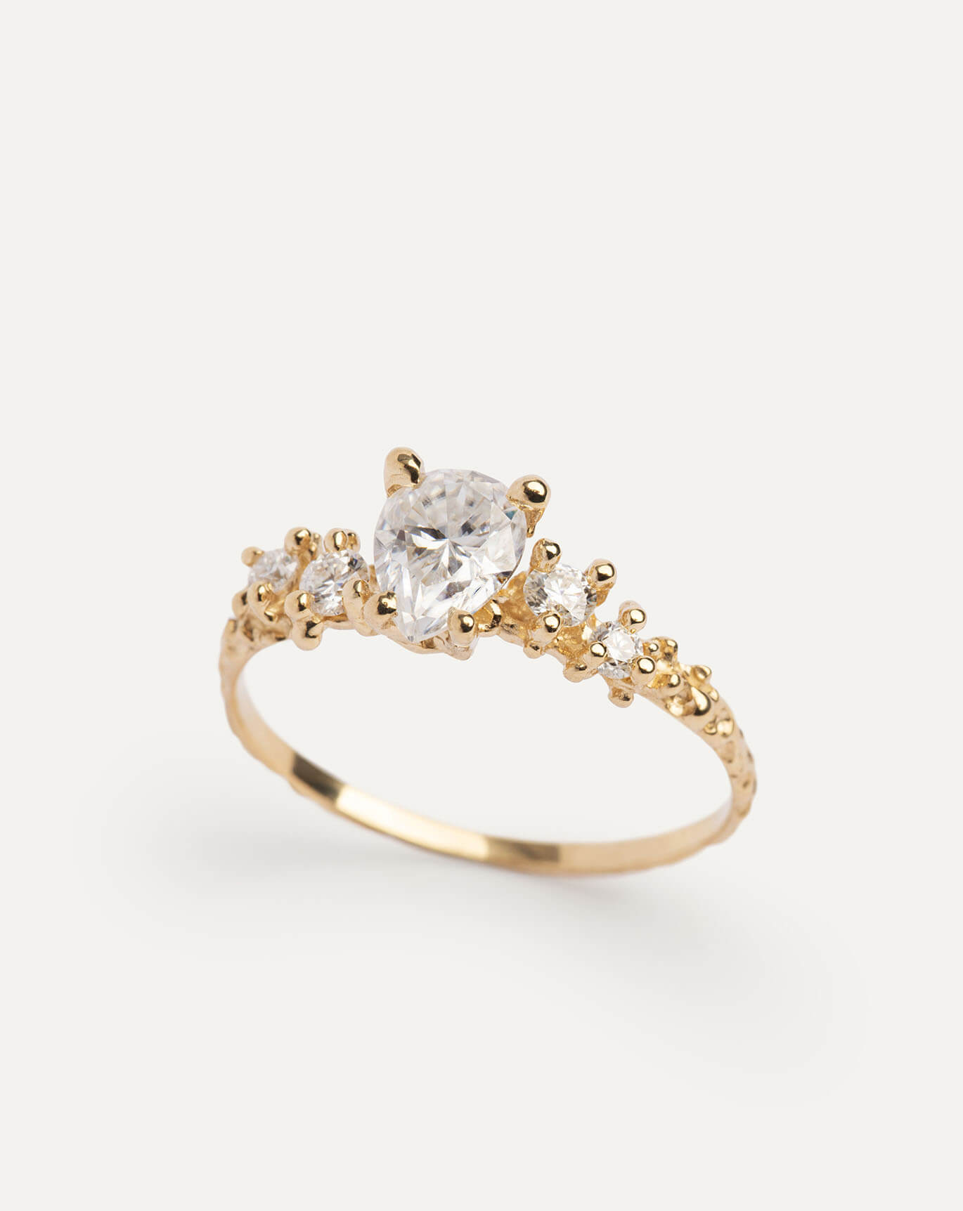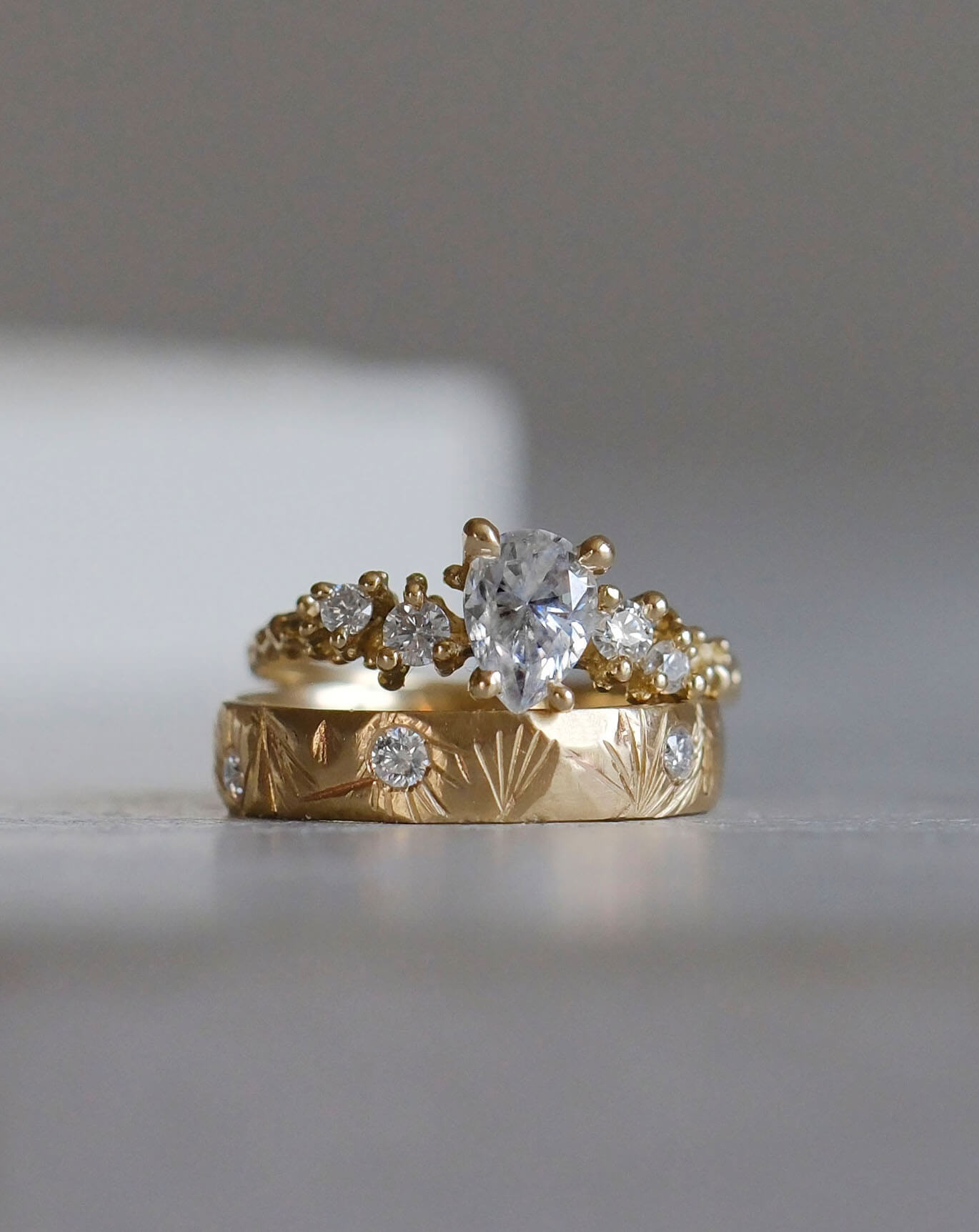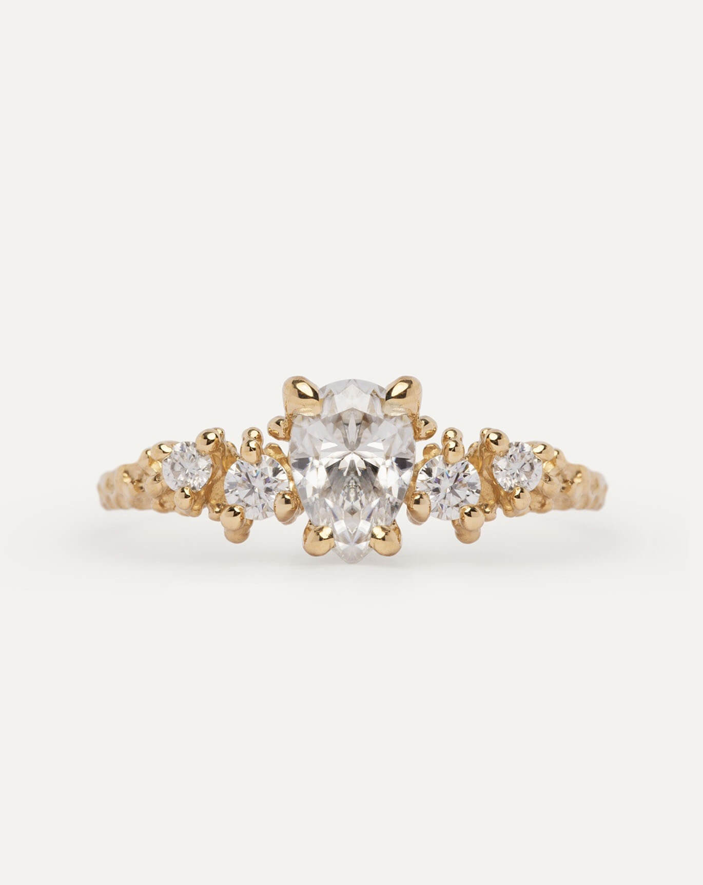 Description : Central diamond: lab. grown, pear cut 0.49-0.51carat, color D, clarity VVS1, polish Excellent. Side diamonds: lab. grown, round cut 0.26carat, color D, Clarity VVS1, polish Excellent
